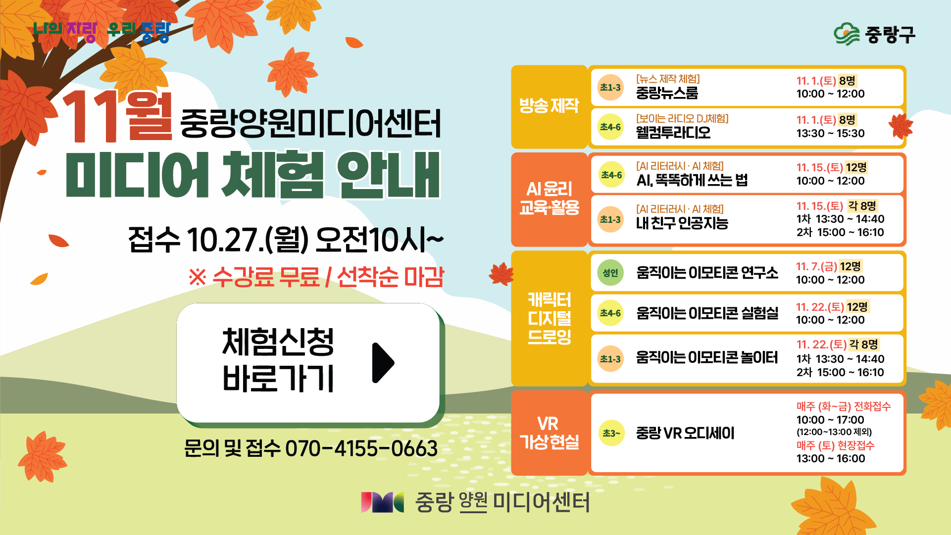 ① 중랑미디어센터는 개인정보의 처리 목적에 필요한 최소한의 개인정보를 수집합니다. 중랑구청의 개인정보파일 현황 및 처리하는 개인정보의 항목에 관한 상세한 등록사항은 개인정보보호위원회 개인정보보호 종합지원 포털(www.privacy.go.kr) → 민원마당 → 개인정보열람 등 요구 → 개인정보파일 목록검색 메뉴에서 확인해주시기 바랍니다.